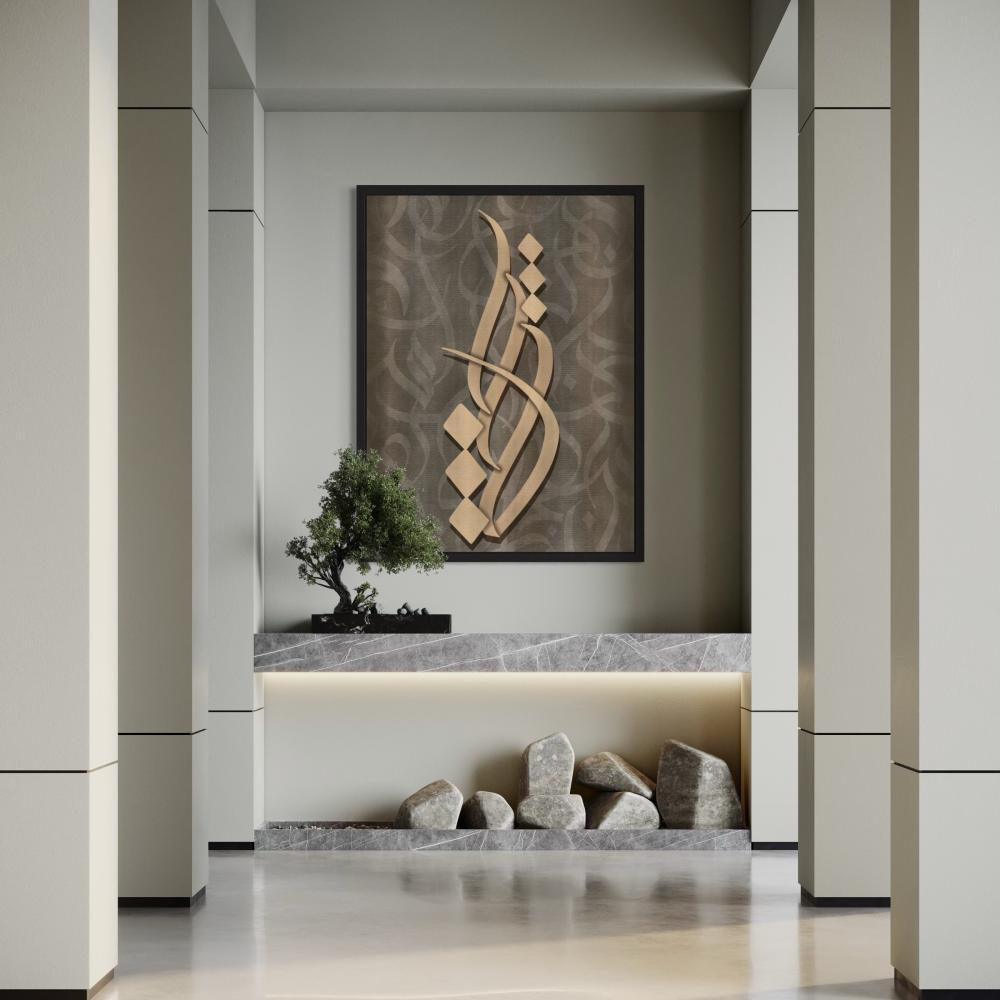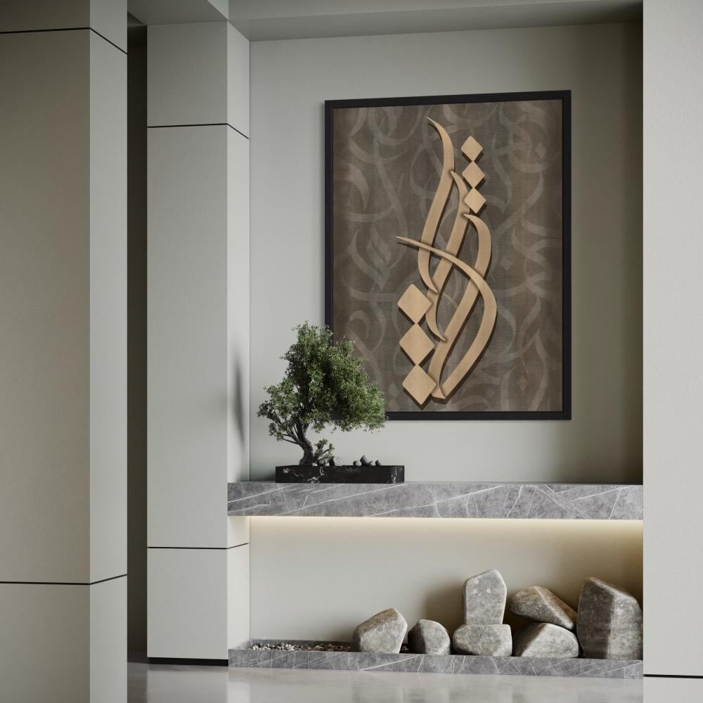 تتألق هذه اللوحة بجمال الحروف العربية التي تتشابك بانسيابية في تصميم تجريدي يعبر عن الغموض والجمال الأبدي.