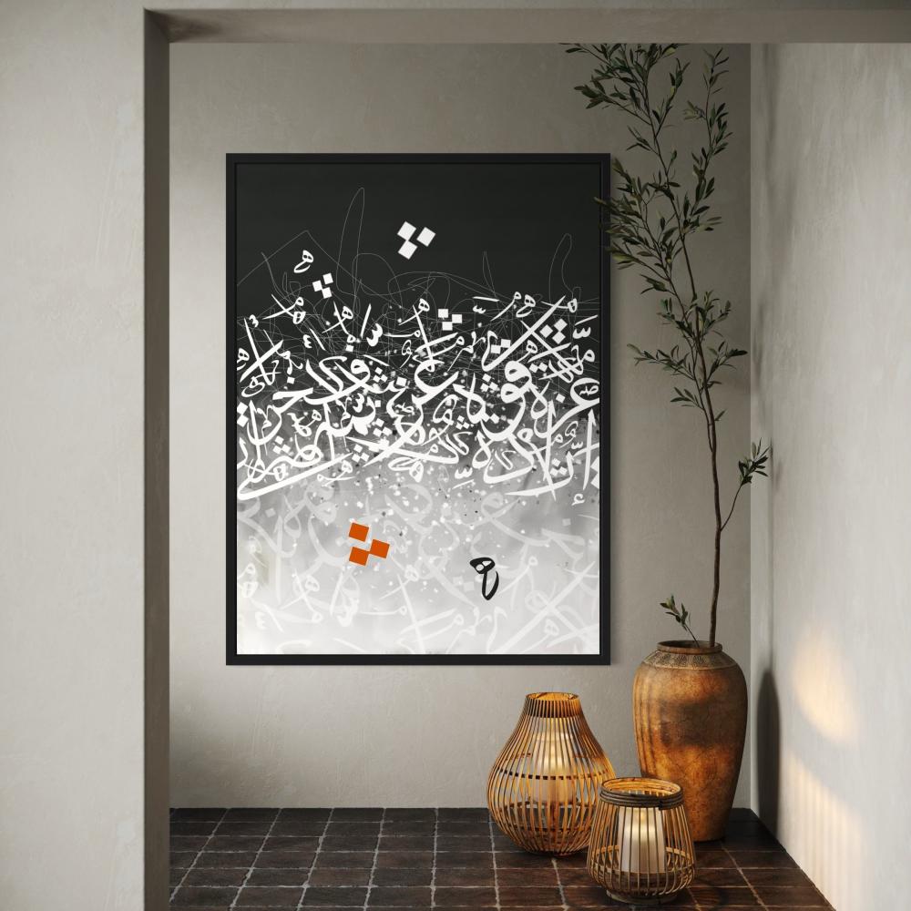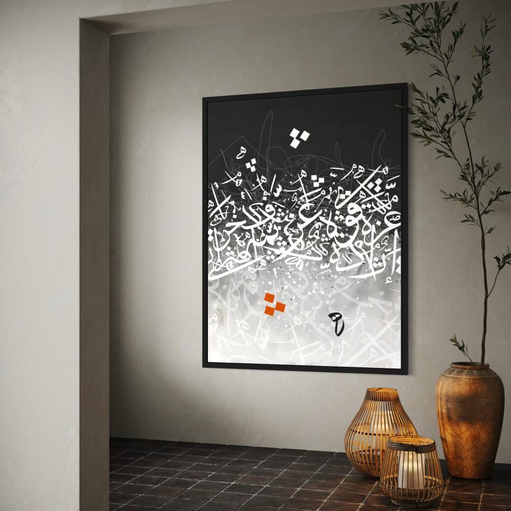 لوحات جدارية خط عربي "روح الإرادة" هي لوحة فنية مستوحاة من خط الثلث العربي الأصيل، حيث تتشابك كلمات مثل فخر، عزة، صبر، قوة، وإرادة بخطوط بيضاء أنيقة تنبثق من خلفية داكنة. الأبيض يرمز إلى النقاء والسمو، بينما يعبر العمق اللوني عن التحديات التي تتحول إلى مصدر قوة، مما يعكس رحلة الإنسان في مواجهة الصعاب.