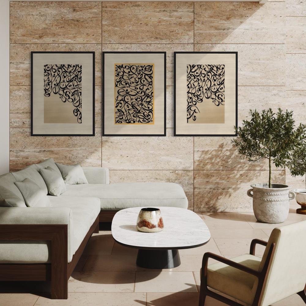 لوحة ثلاثية "سرّ الانسياب" هي مجموعة فنية مستوحاة من جماليات الخط الديواني، حيث تبرز انحناءاته وانسيابه الفريد في تكوينات بصرية مترابطة. تعكس هذه اللوحة تناغم التراث مع الرؤية المعاصرة، مدعومة ببساطة عميقة وتفاصيل دقيقة تجعلها قطعة ديكورية راقية. تصميمها الثلاثي يضيف بعدًا بصريًا يناسب الجدران الكبيرة، معززًا إحساساً بالهوية والانسجام في أي مساحة.